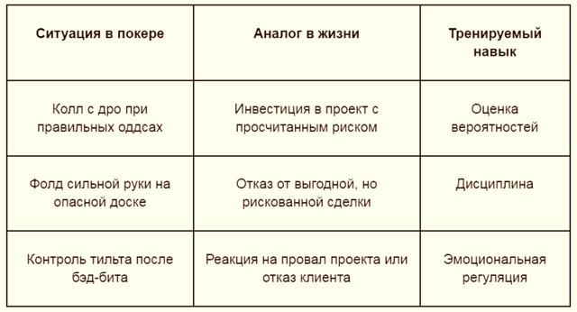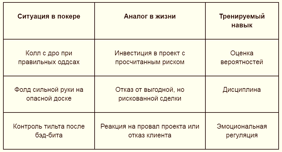 - Отделение результата от качества решения – худшая ловушка мышления: «я проиграл, значит решение было плохим». Покер обучение вбивает обратное: можно сделать все правильно и проиграть. Можно сделать глупость и выиграть. Оценивать нужно процесс, а не исход. В бизнесе этот навык стоит дорого;